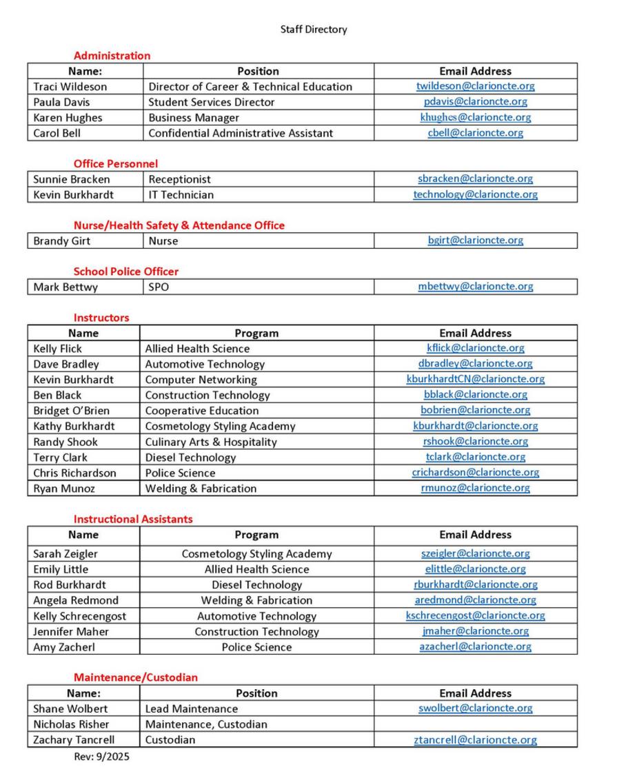 The Clarion County Career Center will not discriminate in its educational programs, activities, or employment practices, based on race, color, national origin, sex, sexual orientation, disability, age, religion, ancestry, union membership, creed, marital status, veteran's status or any legally protected classification. Announcement of this policy is in accordance with state and federal laws, including Title IX of the Education Amendments of 1972, Section 503 and 504 of the Rehabilitation Act of 1973, and the Americans with Disabilities Act of 1990. The Clarion County Career Center employees and participants who have an inquiry or complaint of harassment or discrimination, or who need information about accommodations for persons with disabilities, should contact Paula Davis, the Title IX & 504 Coordinator, Clarion County Career Center, 447 Career Lane, Shippenville, PA 16254, 814-226-4391 or pdavis@clarioncte.org